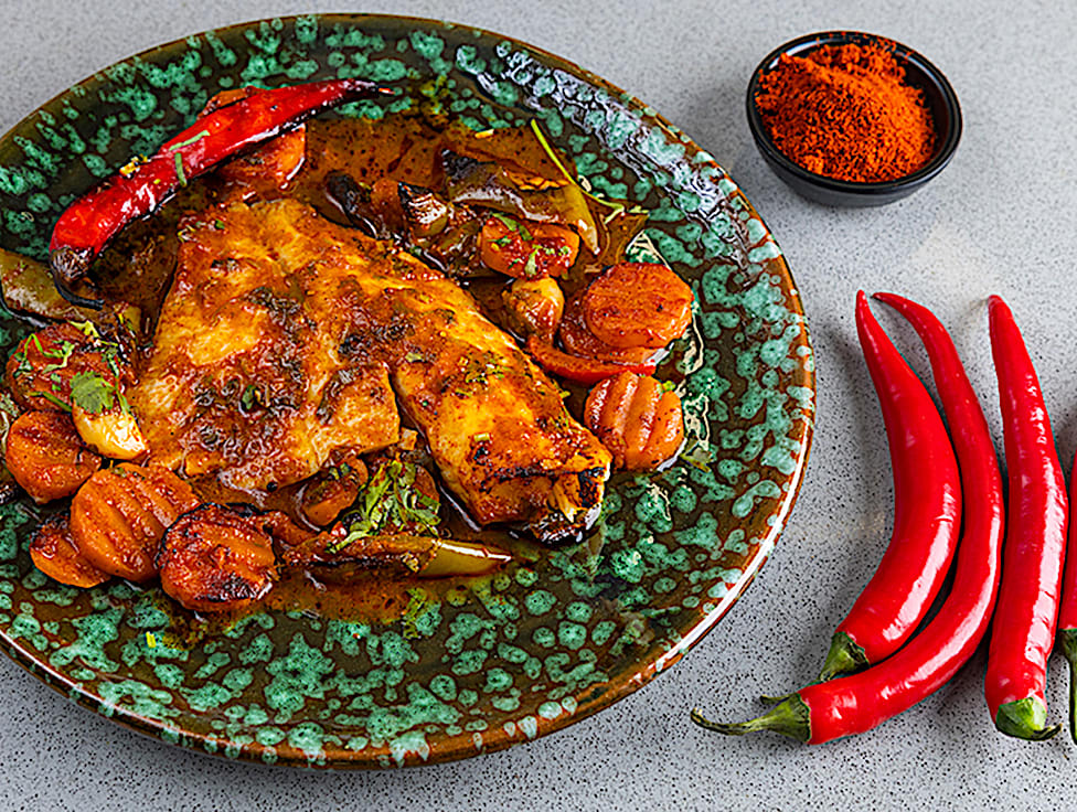 פילה אמנון ברוטב מרוקאי (לא חריף)- ניתן לבקש חריף - פילה אמנון, פלפל אדום, גזר, עגבניות, כוסברה, שום טרי, גרגירי חומוס, פלפל חריף, פפריקה מתוקה, מלח, שמן קנולה