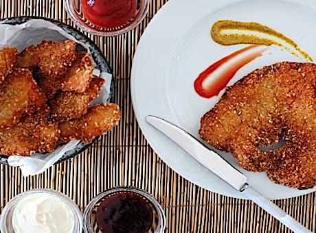 שניצל קלאסי** - חזה עוף טרי, ביצה, פירורי לחם, שומשום, שבבי קוקוס, קמח, מלח, חרדל חלק, מיונז, שמן קנולה