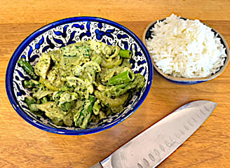 פילה עוף בקרם קוקוס ופסטו ביתי** ניתן לקחת טבעוני - פילה עוף טרי, קישוא, ברוקולי, בזיליקום, קשיו, שמן זית, מלח, פלפל שחור, שום, קרם קוקוס, בצל ירוק, בצל, סויה, שמן שומשום, שמן קנולה, (תוספת אורז - אורז, שמן קנולה, מלח)